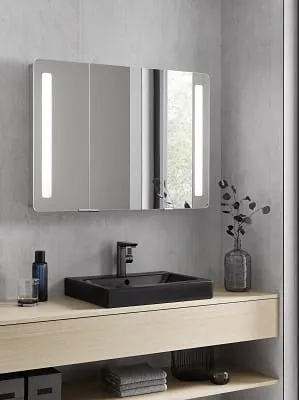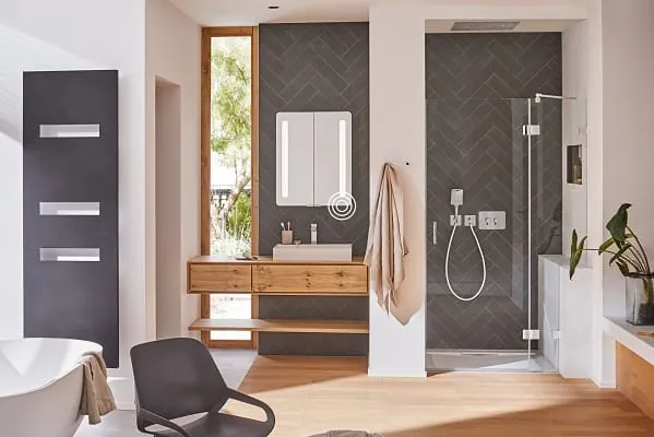 Das umfangreiche Alu-Spiegelschrank-Sortiment von HSK Duschkabinenbau bietet praktischen Stauraum und optimale Sicht. Modernes und klares Design, kombiniert mit praktischen Funktionen, macht es zu einem Must-have für jedes Bad. – © HSK Duschkabinenbau KG