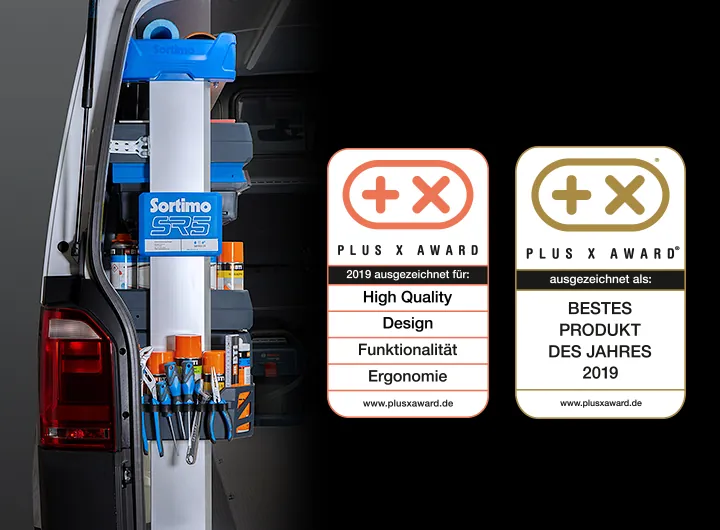 Die SR5-Fahrzeugeinrichtung von Sortimo erhielt den Plus X Award als „Bestes Produkt des Jahres 2019“. Außerdem bekam das Regalsystem vier der sieben Gütesiegel für ausgezeichnete Markenqualität verliehen.