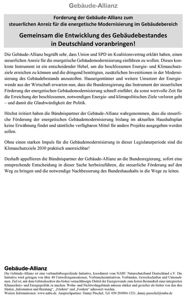 Den Brandbrief der Gebäude-Allianz, eine verbandsübergreifende Initiative aus über 30 Organisationen von Verbraucherschützern über Wirtschaftsverbänden und Gewerkschaften bis zu Umwelt-NGOs, finden Sie hier.