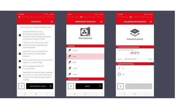 Auf einer übersichtlichen Bedienoberfläche fragt die Start-App alle relevanten Details zur neu installierten Anlage ab. Der Fachhandwerker folgt praktisch einem roten Faden: Er wählt Verwendungszweck, Nennsollwert, Bivalenz-Temperatur und weitere Einstellungen direkt auf seinem persönlichen Mobilgerät aus. Anschließend überträgt das Profi-Service-Set die Konfigurationsdaten per Bluetooth an den Wärmeerzeuger. Nach Eingabe aller wichtigen Parameter erfolgt die automatische Inbetriebnahme.