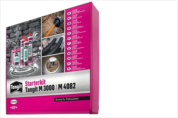 Das Starterkit enthält alle wichtigen Komponenten. Dazu gehören drei Kartuschen – à 300 ml – des 2K-Expansionsharzes Tangit M 3000. Das Produkt eignet sich zur Abdichtung von Ein- und Mehrsparten-Hauseinführungen sowie für Abwasser- und Kabel-Wanddurchführungen, für die Reparatur undichter Durchführungen und für den Brunnenbau geeignet.