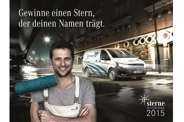Bis zum 12. Januar 2015 werden unter Schirmherrschaft der Aktion Modernes Handwerk e. V. und mit der Unterstützung des Mercedes-Benz Deutschland Vertrieb Transporter und Vans die besten Fahrzeugbeschriftungen eingetragener Handwerksbetriebe gesucht. Diese können sich mit Fotos ihres teil- oder vollverklebten Firmenwagens auf www.sterne-des-handwerks.de bewerben.