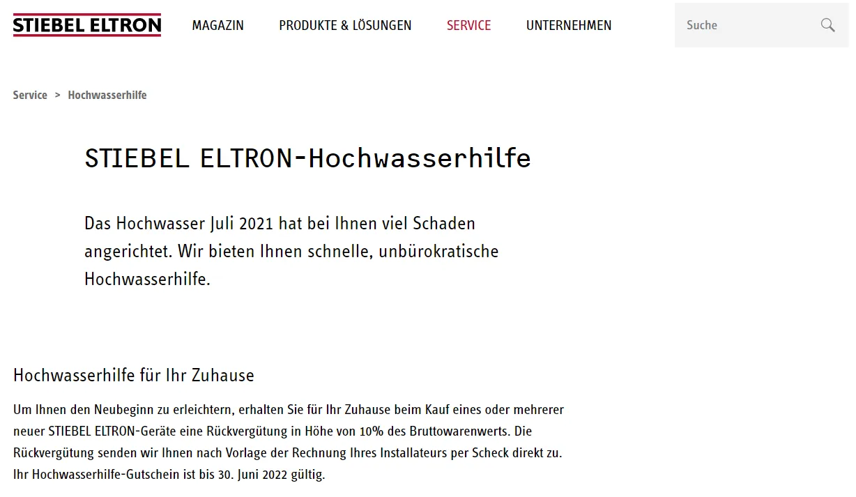 Hochwasser-Geschädigten beim Kauf eines neuen Stiebel Eltron-Gerätes bis zum 30. Juni 2022 eine Rückvergütung in Höhe von zehn Prozent vom Bruttowarenwert.