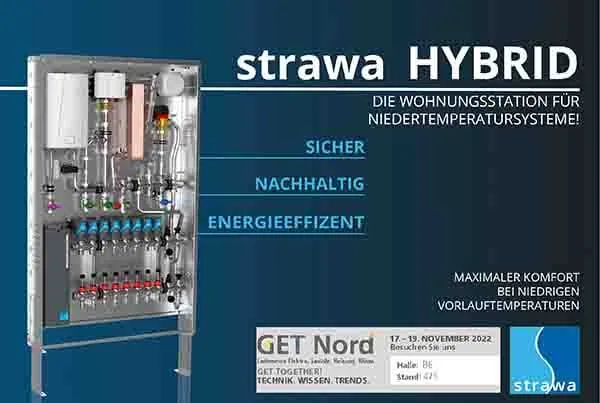 strawa präsentiert auf der GET Nord 2022 vom 17. bis 19. November 2022 seine Frischwasser- und Wohnungsstationen. Doch auch ein Regelantrieb für den automatischen hydraulischen Abgleich sowie der strawa-Produkt-Konfigurator für Comfort-Wärmestationen sind einen Besuch am Messestand wert.