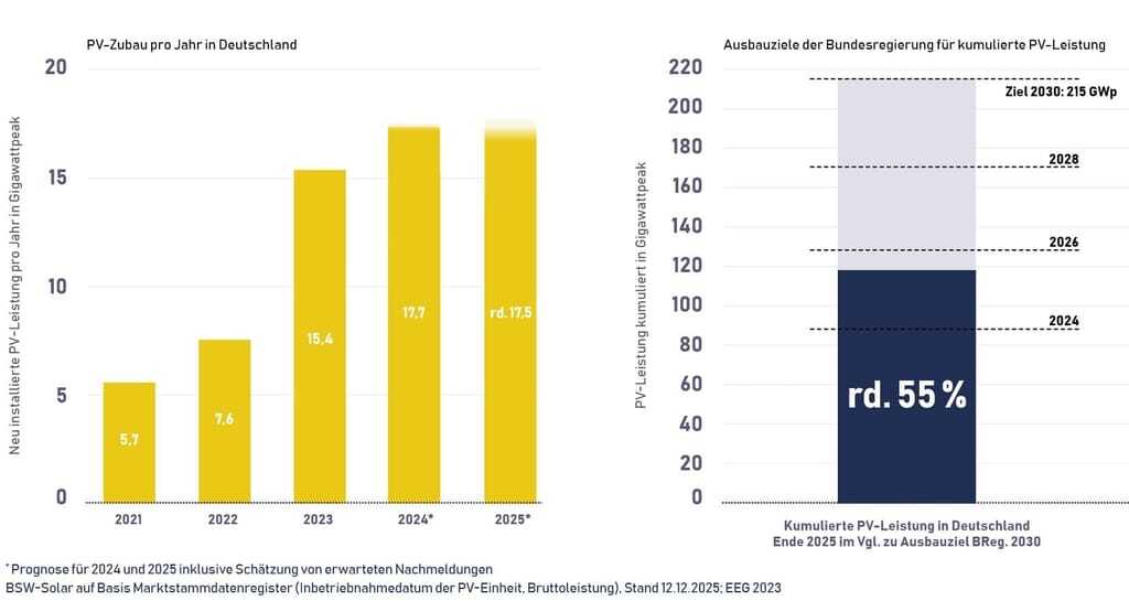 So sei die Stromerzeugung aus PV-Anlagen zwar deutlich gestiegen. Das solare Ausbautempo habe sich aber 2025 entschleunigt. Nach Verbandsangaben wurden vorläufigen Prognosen nach im Jahr 2025 neue Solarstromanlagen mit einer Leistung von rund 17,5 GWp in Deutschland neu in Betrieb genommen. Die neu installierte Photovoltaikleistung liegt damit in etwa auf Vorjahresniveau von 17,7 GWp.