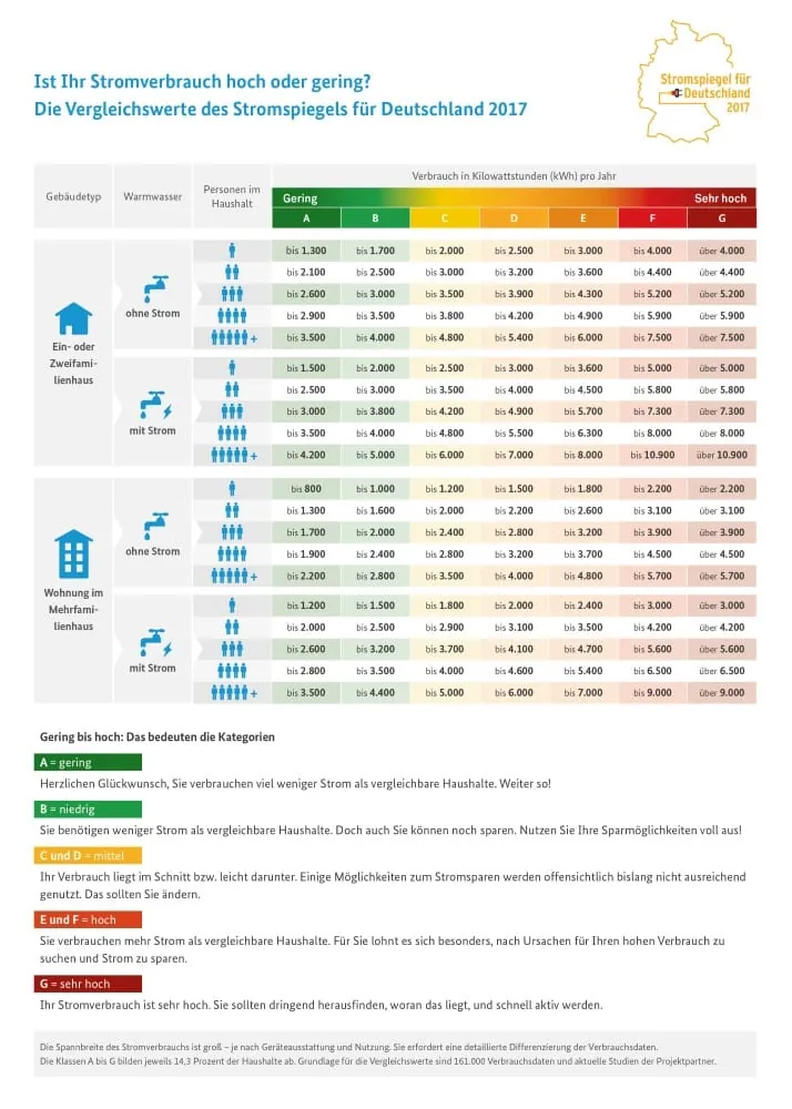 Mit dem Stromspiegel können Privathaushalte leicht feststellen, wie groß ihr Sparpotenzial ist: Die eigene Stromrechnung und die bundesweiten Vergleichswerte des Stromspiegels genügen, um den Verbrauch in eine von sieben Kategorien einzuordnen. Wie beim EU-Energielabel bedeutet „grün“ (Klasse A) einen geringen Verbrauch und „rot“ (Klasse G) einen sehr hohen Verbrauch.