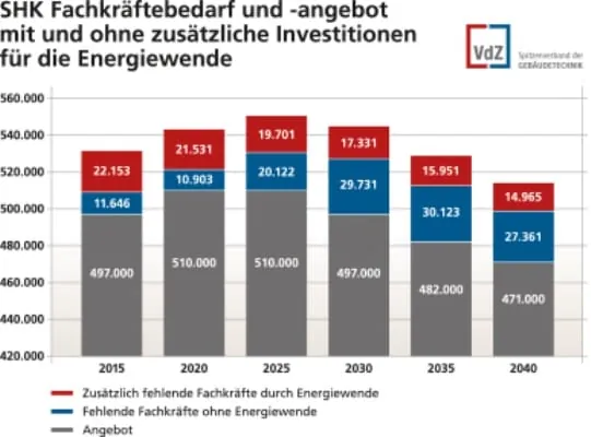 Der zusätzliche Investitionsbedarf im Rahmen der Energiewende führt für die SHK-Branche zu einem erheblichen Mehrbedarf an Fachkräften. Zu diesem Ergebnis kommt eine aktuelle Studie, die Prognos im Auftrag des Spitzenverbandes der Gebäudetechnik (VdZ) durchgeführt hat.