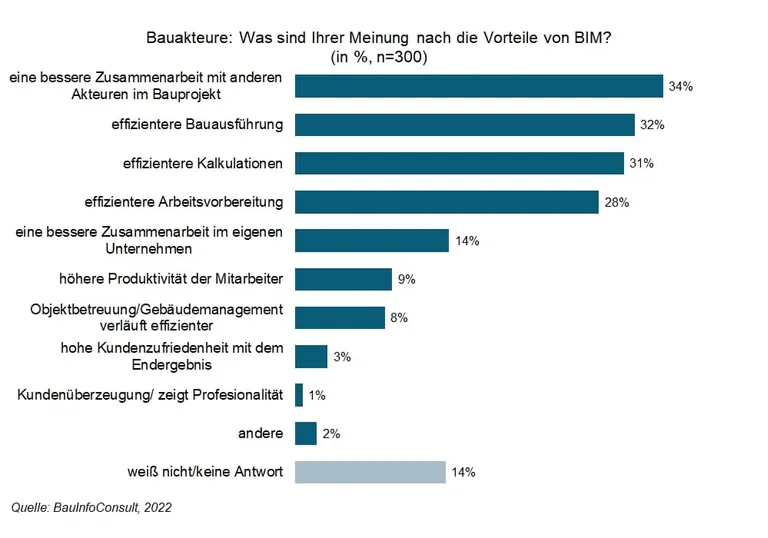 Bei den Bauprofis, die bereits selbst mit BIM arbeiten, berichtet sogar jedes zweite Unternehmen diese Effizienzsteigerungen. Außerdem haben BIM-nutzende Unternehmen häufig die Erfahrung gemacht, dass die Zusammenarbeit mit Externen sowie mit den Kolleginnen und Kollegen im Unternehmen durch BIM besser klappt. Auch die Produktivität im Unternehmen steigt nach Erfahrung jedes fünften BIM-Anwenders.