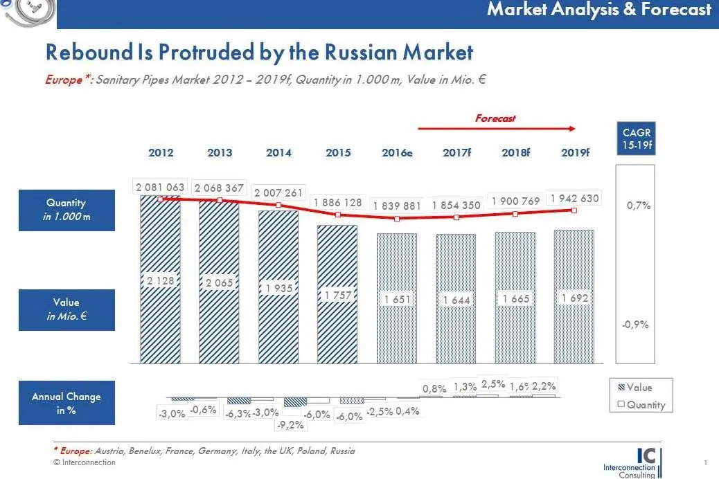 Der Markt für Sanitärrohre in Europa hat 2015 einen empfindlichen Umsatzrückgang von 9,2 Prozent verbuchen müssen. Dabei war nicht allein der russische Markt für die Geschäftseinbußen verantwortlich. Auch der westeuropäische Markt musste schon zum wiederholten Male empfindliche Umsatzeinbußen hinnehmen, wie eine neue Studie von Interconnection Consulting zeigt.