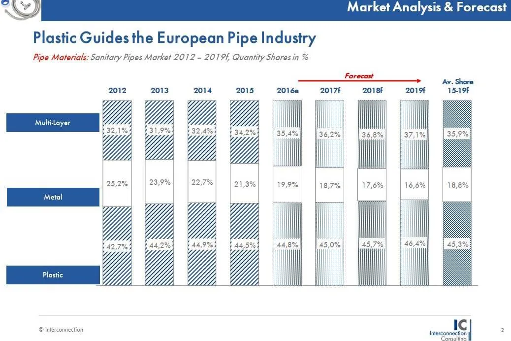 Gestützt auf EU-Richtlinien im Sanitärbereich rechnet Interconnection in den kommenden Jahren mit einer weiteren Verbreitung von Kunststoff- bzw. Multi-Layer Rohren zu Lasten von Metall. So ist z.B. der Anteil von Metallrohren zwischen 2012 und 2015 in Italien von 25,9 Prozent auf 20,4 Prozent zurückgegangen. Am stärksten sind Metallrohre noch in Großbritannien, Deutschland und Italien vertreten. Am unteren Ende dieser Skala befinden sich Polen, Russland und Österreich.