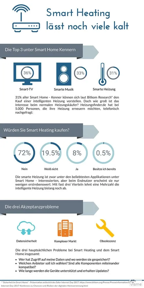 „Bislang scheint Smart Heating – und Smart Home generell – eine Sache für Early Adopter zu sein, die gerne als erste moderne Technologien nutzen und sich als Vorhut der Entwicklung betrachten. Der normale Hausbesitzer besitzt nach eigener Einschätzung nicht über genügend Informationen und steht den noch bestehenden Problemen sehr skeptisch gegenüber“, heißt es weiter aus Hamburg. Daher sei – vom technischen Bereich abgesehen – noch viel Aufklärungsarbeit zu leisten, wenn smarte Heiztechnik wirklich zum Standard werden soll.