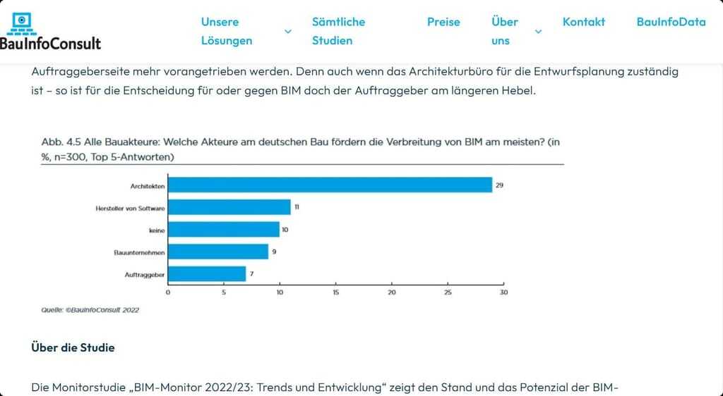 Bei der telefonischen Befragung im Auftrag des Düsseldorfer Marktforschungsunternehmens BauInfoConsult wurden 150 (mittel)große Architektur- und Ingenieurbüros sowie größere Bau- und Installationsbetriebe zu ihren Erfahrungen und Einschätzungen zum Thema BIM gebeten. Dabei wurden sie auch um eine allgemeine Einschätzung gebeten, welche Bauakteure die Verbreitung von BIM am deutschen Bau am meisten fördern. Der erste Platz auf dem Siegertreppchen überrascht kaum: