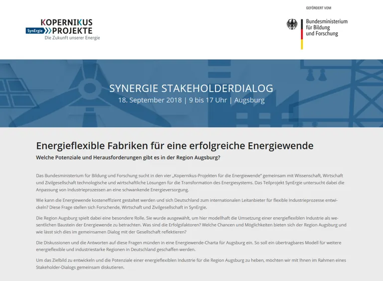 Zu diesem Zweck wird im Rahmen des Stakeholderdialogs der Beitrag energieflexibler Fabriken für die Region Augsburg dargestellt und wesentliche Fragestellungen der Zivilgesellschaft zur Flexibilisierung industrieller Verbraucher aufgenommen.