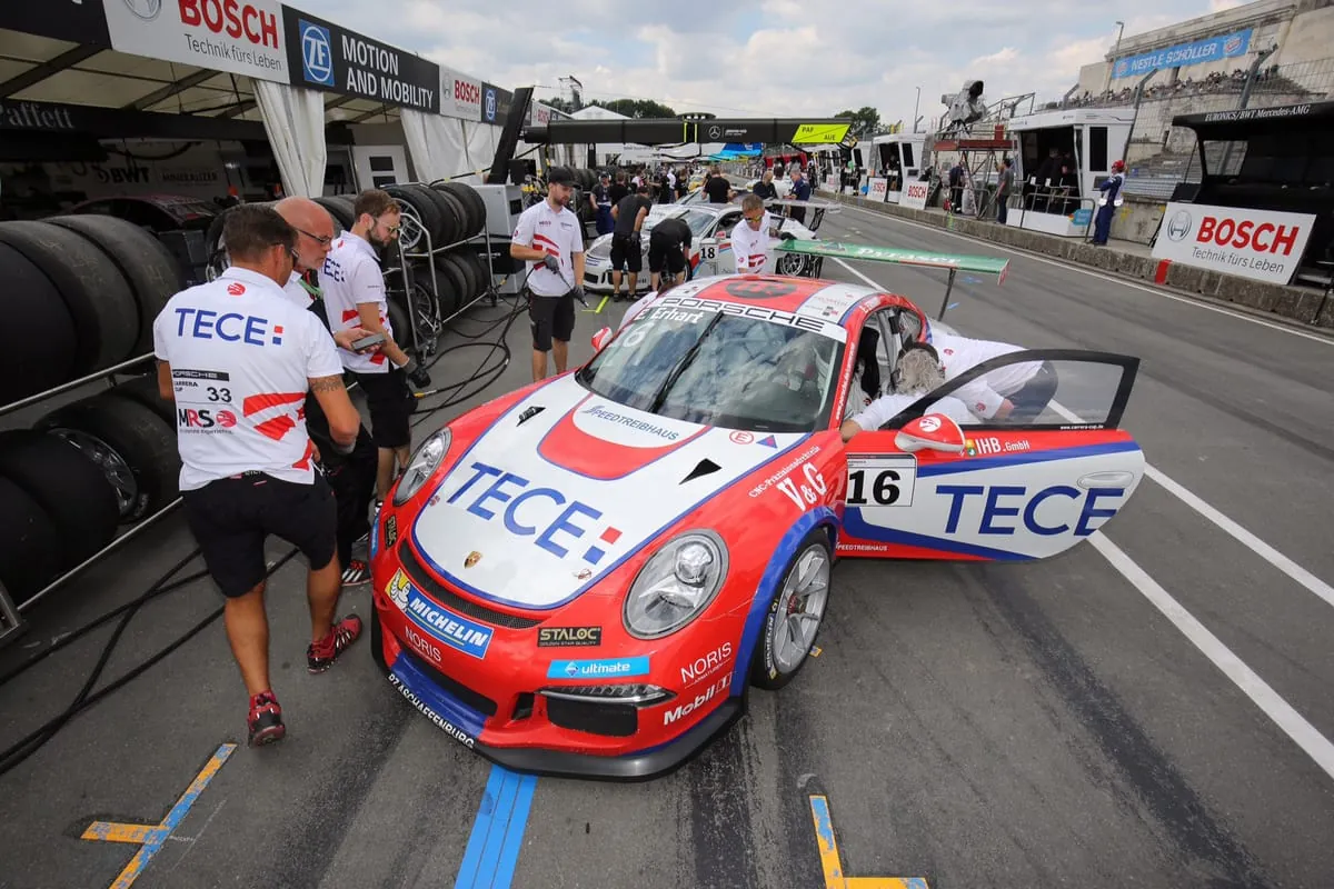 Ende Juni gastierte der Porsche Carrera Cup am traditionsreichen Norisring: 350 Planer, SHK-Handwerker und Architekten reisten nach Franken, um die Fahrer des Tece-Teams Elia Erhart und Richard Goddard anzufeuern. Den Teilnehmern bot sich die Möglichkeit, ganz nah am Renngeschehen dabei zu sein: Zwischen Training, Qualifikation und Rennen hatten die Gäste die Gelegenheit, die Strecke inklusive Fahrerlager zu besichtigen. Ein glücklicher Teilnehmer hatte nach gewonnener Verlosung das einmalige Vergnügen, sich von Elia Erhart im Streckentaxi über den Norisring fahren zu lassen. Klemens Reignault, Leiter Objektmanagement bei Tece: „Das Wochenende war ein voller Erfolg. Die Teilnehmerzahl von 350 Leuten aus der Branche spricht für sich. Das liegt nicht nur am Renn-, sondern auch am Rahmenprogramm.“