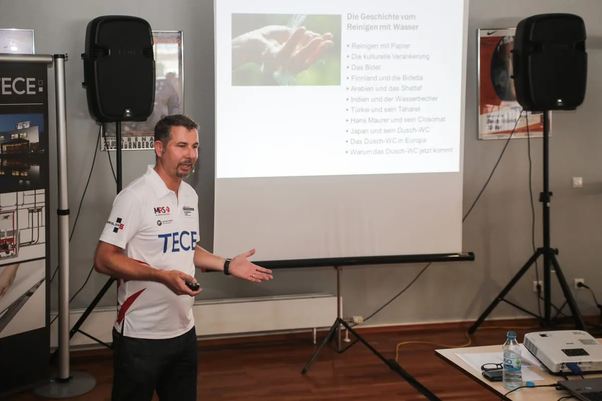 Robert Schilling, Seminarleiter bei Tece, nutzte die Gelegenheit und ergänzte den Informationsteil mit einem Vortrag in eigener Sache. Sein Thema: Die „Geschichte des Reinigens mit Wasser“ und die Entwicklung des Dusch-WCs. Passend dazu wurde unter anderem das Teceone präsentiert, das im kommenden Frühjahr erscheinende WC mit Bidetfunktion. Die Innovation: Teceone verzichtet im Gegensatz zu herkömmlichen Dusch-WCs auf technische Spielereien wie Fernbedienung oder Sitzheizung und konzentriert sich konsequent auf die Kernfunktion: das Reinigen mit Wasser.