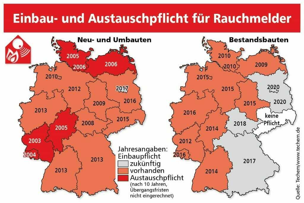 Das Gesetz zum Einbau von Rauchwarnmeldern in Neu- und Umbauten ist in einigen Bundesländern wie dem Saarland oder Schleswig-Holstein (2004 bzw. 2005) bereits vor Jahren in Kraft getreten. Für Bestandsbauten galten zwar noch entsprechende Übergangsfristen, aber so mancher Eigentümer und Vermieter muss sich trotzdem auch bei diesen Gebäuden schon heute Gedanken um die Nachfolge der Geräte machen.