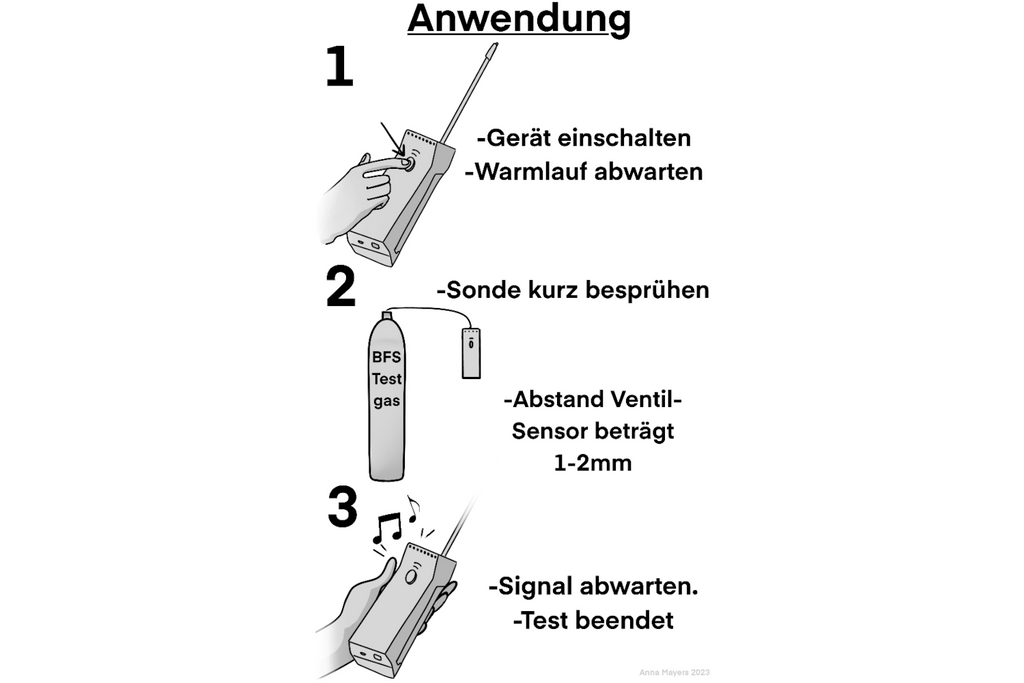 Das Testverfahren lässt sich für eine Überprüfung einfach durchführen. Dazu wird das BFS-Testgas auf die Sonde des Gasmeldegeräts gesprüht. Dadurch wird der Sonde eine vergleichbare Gaskonzentration angeboten, wie sie sich in unmittelbarer Nähe zu einem realen Leck an einer Kälte- oder Klimaanlage ausbilden würde. Sofern das Meldegerät anschließend Signale abgibt, ist dieses positiv geprüft. Damit ist das Gerät einsatzbereit.