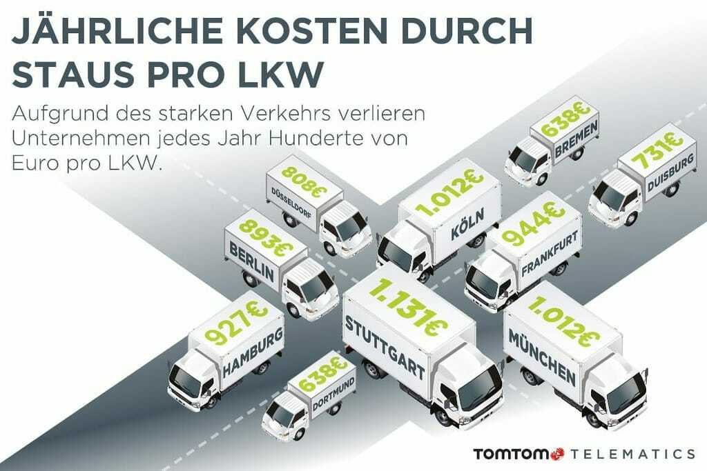 Der TomTom „Traffic Index Report“ zeigt, dass sich durch den starken Verkehr die Gesamtdauer der Fahrtzeit in deutschen Städten um durchschnittlich 26 % erhöht. Das verlängere die auf der Straße verbrachte Zeit um 27 Minuten und koste jeden Fahrer der 239.325 in den deutschen „Top 10 Städten“ mit dem höchsten Stauaufkommen zugelassener LKW rund 3,83 Euro pro Tag.