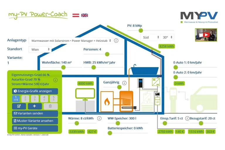 Der Power-Coach berechnet anhand der Angaben die Höhe des Eigenverbrauchs, den Autarkiegrad und die jährlichen Betriebskosten. „Mit dem Power-Coach haben wir ein einfaches und kostenfreies Werkzeug entwickelt, mit dem Jedermann bequem am PC oder Handy den Eigenverbrauch optimieren kann“, erklärt my-PV-Geschäftsführer Dr. Gerhard Rimpler.