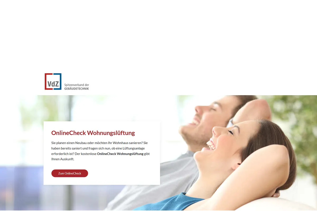 Der OnlineCheck Wohnungslüftung ist ein Angebot der VdZ. Es wurde in Zusammenarbeit mit dem BDH – Bundesverband der Deutschen Heizungsindustrie, der HEA – Fachgemeinschaft für effiziente Energieanwendung e.V., dem VfW – Bundesverband für Wohnungslüftung und dem ZVSHK – Zentralverband Sanitär Heizung Klima erarbeitet. Die Berechnung erfolgt auf Grundlage der Wohnungslüftungsnorm DIN 1946-6.