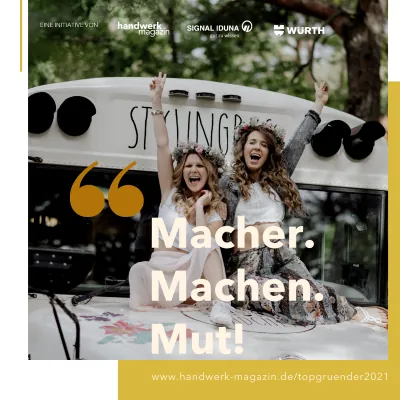 Mit Unterstützung von Familie und Freunden leben sie trotzdem ihren Traum und sind bei den Zahlen voll im Soll ihres Business-Plans. Es sind genau solche Geschichten, die „handwerk magazin“ und die Partner des „Top Gründer“, die Signal Iduna Gruppe sowie die Adolf Würth GmbH & Co. KG, dazu bewogen haben, auch in diesen herausfordernden Zeiten den „Top Gründer“ Preis 2021 auszuschreiben. „Unter dem Motto ‚Macher. Machen. Mut‘ wollen wir jetzt alle Gründerinnen und Gründer aus dem Handwerk für eine Teilnahme begeistern – und ein positives Signal in diesen stürmischen Zeiten setzen,“ erklärt Patrick Neumann, Chefredakteur von „handwerk magazin“. Die Schirmherrschaft hat wie in den Vorjahren das Bundesministerium für Wirtschaft und Energie übernommen.