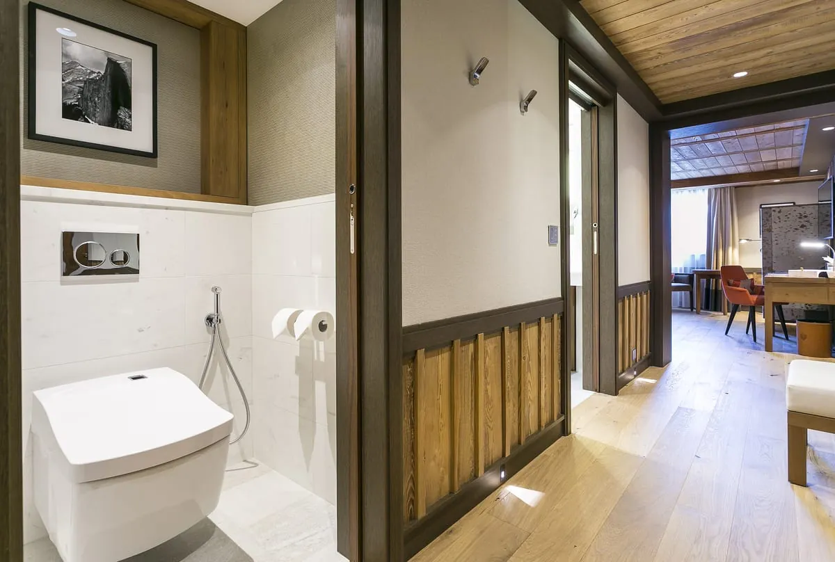 Die 42 Zimmer und Suiten sind ohne Ausnahme mit Washlets von Toto ausgestattet. Für das Interieur werden Stoffe wie Filz, Velours und Kaschmir verwendet, während zeitgemäß gestaltete Wände und Decken aus Lärchenholz an die Ästhetik alter Chalets erinnern sollen.