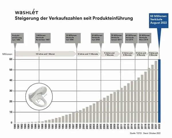 2022 verzeichnet der japanische Komplettbad-Anbieter Toto 60 Mio. verkaufte Einheiten seines Dusch-WCs Washlet weltweit seit der Markteinführung im Jahr 1980. Das ist ein erheblicher Sprung von 50 Mio. auf 60 Mio. in gut drei Jahren. Zum Vergleich: Ganze 18 Jahre hat das Unternehmen benötigt, um von 1980 bis 1998 auf 10 Mio. zu kommen.
