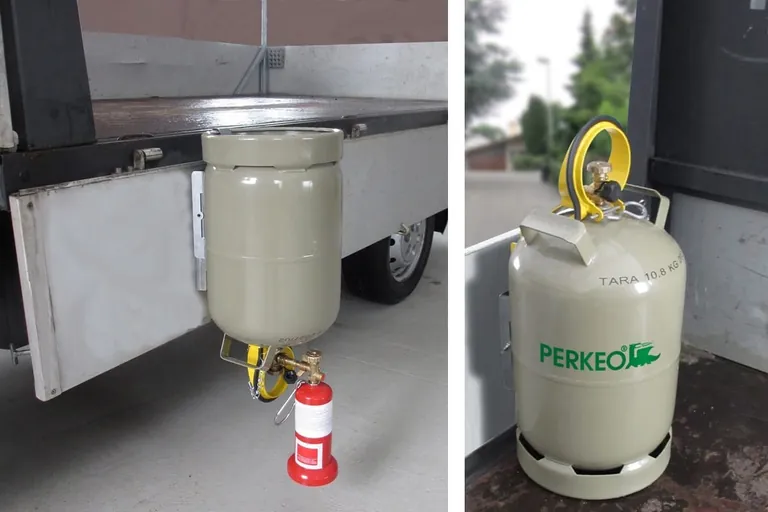 Mit dem patentierten 2 in 1-System T.Rax sorgt Perkeo nun für eine effizientere Arbeitsweise. Denn: die große 11 kg-Propanflasche kann nun immer sicher mit auf die Baustelle genommen und die Montageflaschen direkt vor Ort befüllt werden. T.Rax ist zum einen eine stabile Wandhalterung, zum anderen, an die Ladebordwand (des Pritschenwagens) montiert, eine zuverlässige Transportsicherung. Als solche ist T.Rax BAM- sowie TÜV-geprüft und zugelassen für den Transport im Straßenverkehr gem. VDI 2700 und GGVS/ADR.