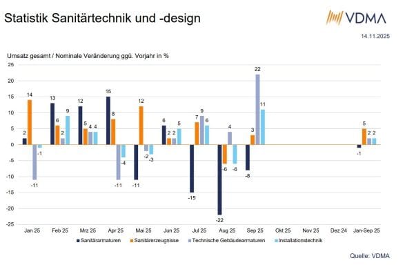 Das neue Branchenbarometer des VDMA erfasst Umsatz und Auftragseingang in allen Segmenten der Sanitär- und Installationstechnik. Die ersten Kennzahlen für 2025 zeigen leichtes Wachstum im Inland, gemischte Ergebnisse im Ausland und erste vorsichtige Signale einer Trendwende.