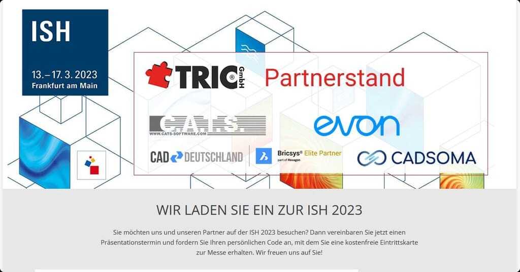 Die Tric GmbH hat auf der ISH 2023 drei Partner am Messestand versammelt: So werden Mervisoft GmbH mit der Marke CAD Deutschland, C.A.T.S. Software GmbH und evon GmbH mit jeweils eigenen Ansprechpartnern am Stand vertreten sein.