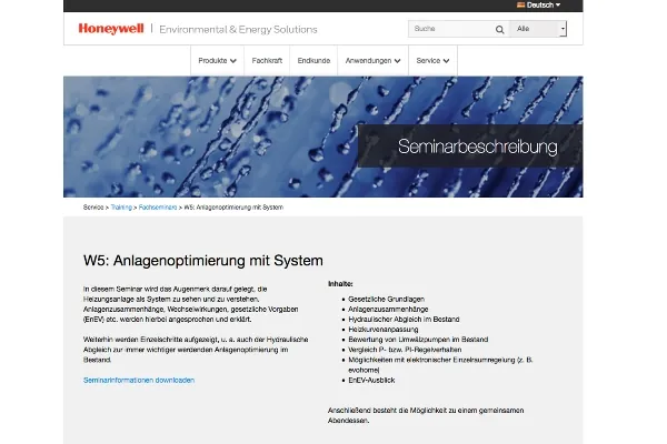 Installateure und Planer können sich im integrierten Servicebereich über Seminare und Weiterbildungsangebote von Honeywell informieren und anmelden.