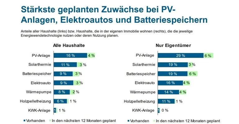 Insgesamt nutzen 13,5 Mio. und damit 33 % der mindestens eine Energiewendetechnologie. Das ist ein Anstieg um 800.000 Haushalte oder zwei Prozentpunkte zu 2024. Zu der eingebauten Technik zählen Wärmepumpen, Photovoltaik-Anlagen, Solarthermie-Anlagen, Batteriespeicher, Kraft-Wärme-Kopplungen, Holzpelletsheizungen und Elektroautos.