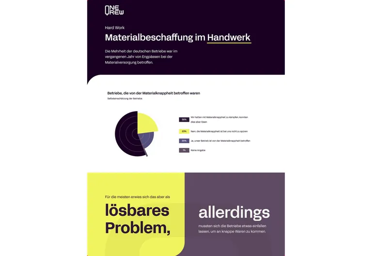 Eine Erhebung von OneQrew zeigt, dass die Materialbeschaffung Handwerksbetrieben viel Zeit kostet und einen erheblichen Aufwand für die Betriebe bedeutet. 2022 waren drei Viertel der deutschen Betriebe von Materialknappheit betroffen. Aufgrund dieser Situation wird viel Zeit für die diversen Bestellmöglichkeiten aufgewendet – durchschnittlich 6,7 Wochenstunden.
