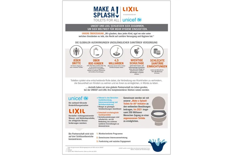 UNICEF und LIXIL haben sich zusammengeschlossen, um benachteiligten Kindern Zugang zu sicheren sowie sauberen Toiletten zu ermöglichen. Mit der Initiative „Make a Splash! Toilets for All“ wollen die beiden Organisationen ihre komplementären Stärken nutzen, um gemeinsam einem der UN-Ziele für nachhaltige Entwicklung näherzukommen: den Zugang zu angemessener und gerechter sanitärer Versorgung und Hygiene für alle gewährleisten und die offene Defäkation bis zum Jahr 2030 beenden.