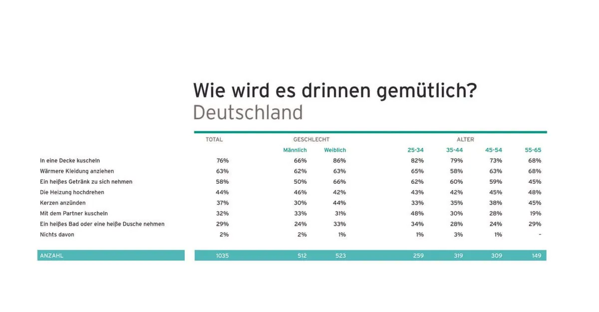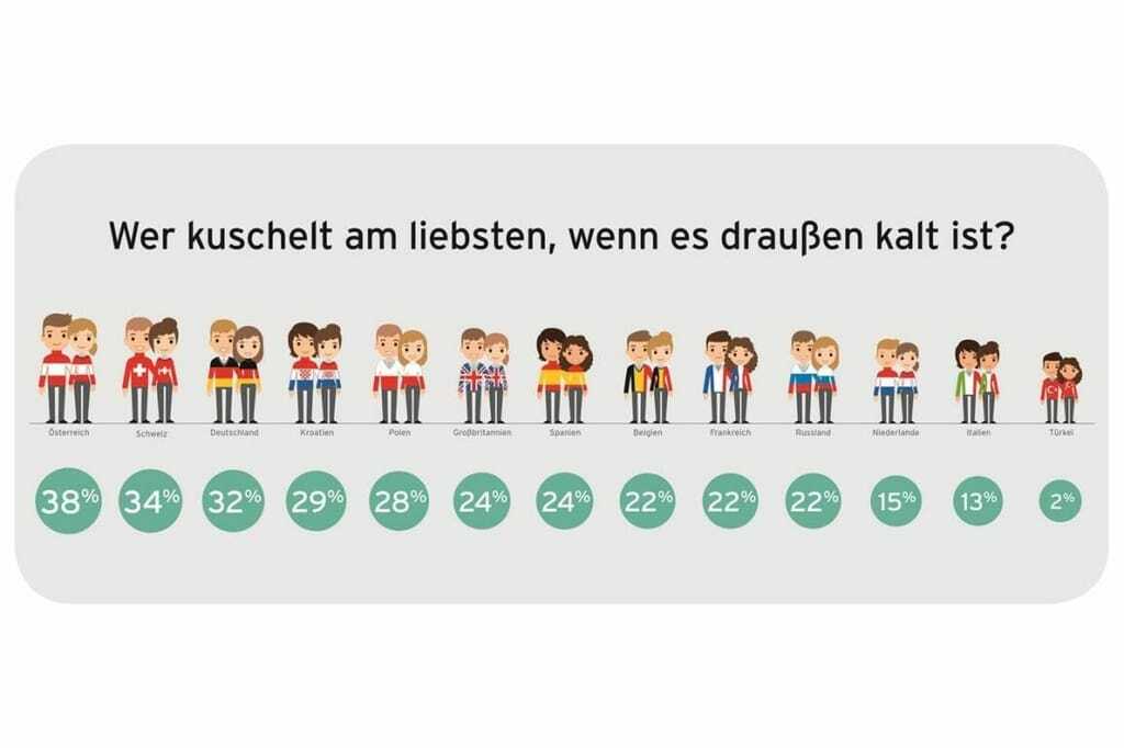 Damit übertrifft Deutschland im internationalen Vergleich deutlich den europäischen Durchschnittswert von 23 %. Das unkuscheligste Land in der Umfrage ist die Türkei. Nur 20 der befragten 1.000 Personen geben Kuscheln als gerne genutzten Kälteschutz an. Die eifrigsten Kuschler leben übrigens in Österreich, dicht gefolgt von der Schweiz und Deutschland.
