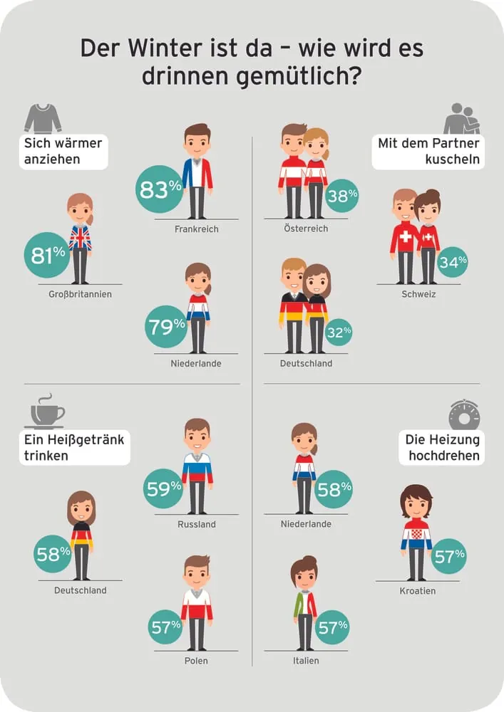 Das beliebteste Mittel gegen die Kälte sind in Deutschland aber dennoch warme Decken. Drei Viertel der Befragten sind von der wärmenden Wirkung dieser zusätzlichen Stofflagen überzeugt. Außerdem beliebt: Knapp 60 % der Deutschen genießen ein heißes Getränk, wenn es draußen kalt ist. Besonders schätzen dies auch die Befragten in den östlichen Staaten Polen und Russland und der Türkei. Vier von zehn der befragten Deutschen stellen dagegen die Heizung einfach auf eine höhere Temperatur ein.