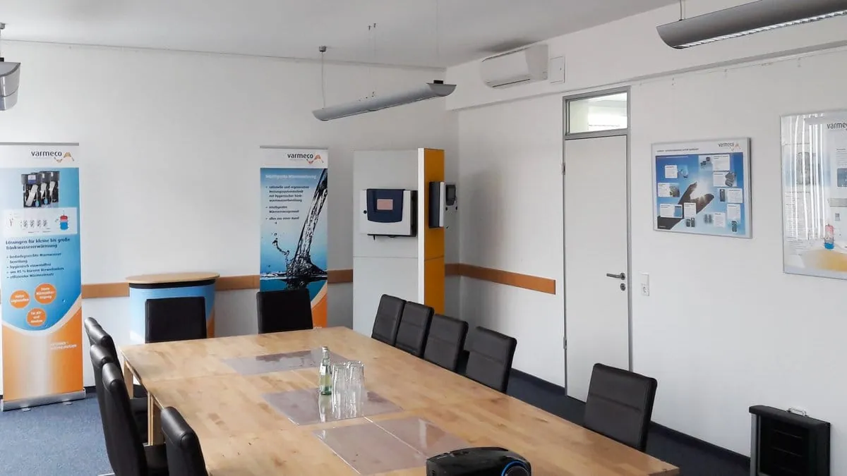 Darüber hinaus verfügt das varmeco-Büro nun über einen großen Schulungsraum für bis zu 40 Personen und ermöglicht die Präsentation von diversen Informations-und Anschauungsmaterialien sowie des varmeco-Frischwassererwärmers.