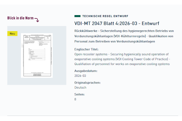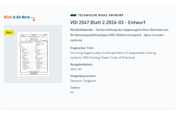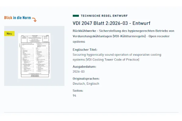 Der VDI hat zwei neue Richtlinienentwürfe zum hygienegerechten Betrieb von Verdunstungskühlanlagen vorgelegt. Die Entwürfe VDI 2047 Blatt 2 und VDI-MT 2047 Blatt 4 zielen darauf ab, gesundheitliche Risiken durch luftgetragene Keime zu minimieren.
