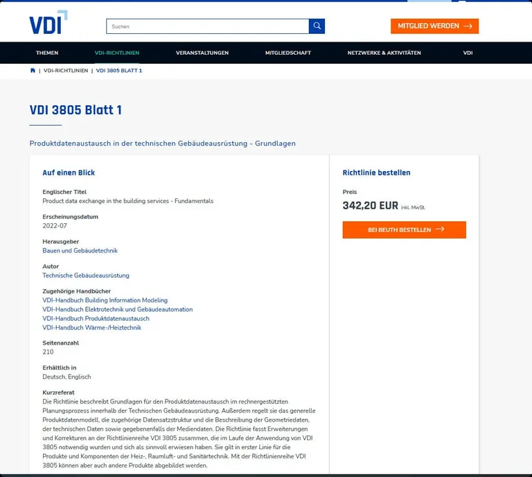 Die VDI 3805 Blatt 1 „Produktdatenaustausch in der technischen Gebäudeausrüstung – Grundlagen“ ist im Juli 2022 als Weißdruck erschienen. Sie kann für 342,20 Euro unter www.beuth.de bestellt werden. VDI-Mitglieder erhalten 10 % Preisvorteil auf alle VDI-Richtlinien.