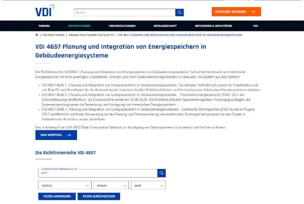 Das in Anhang A der VDI 4657 Blatt 3 beschriebe Webtool zur Auslegung von Stromspeichern ist kostenlos verfügbar. – © Screenshot www.vdi.de (Stand 11.04.2025)
