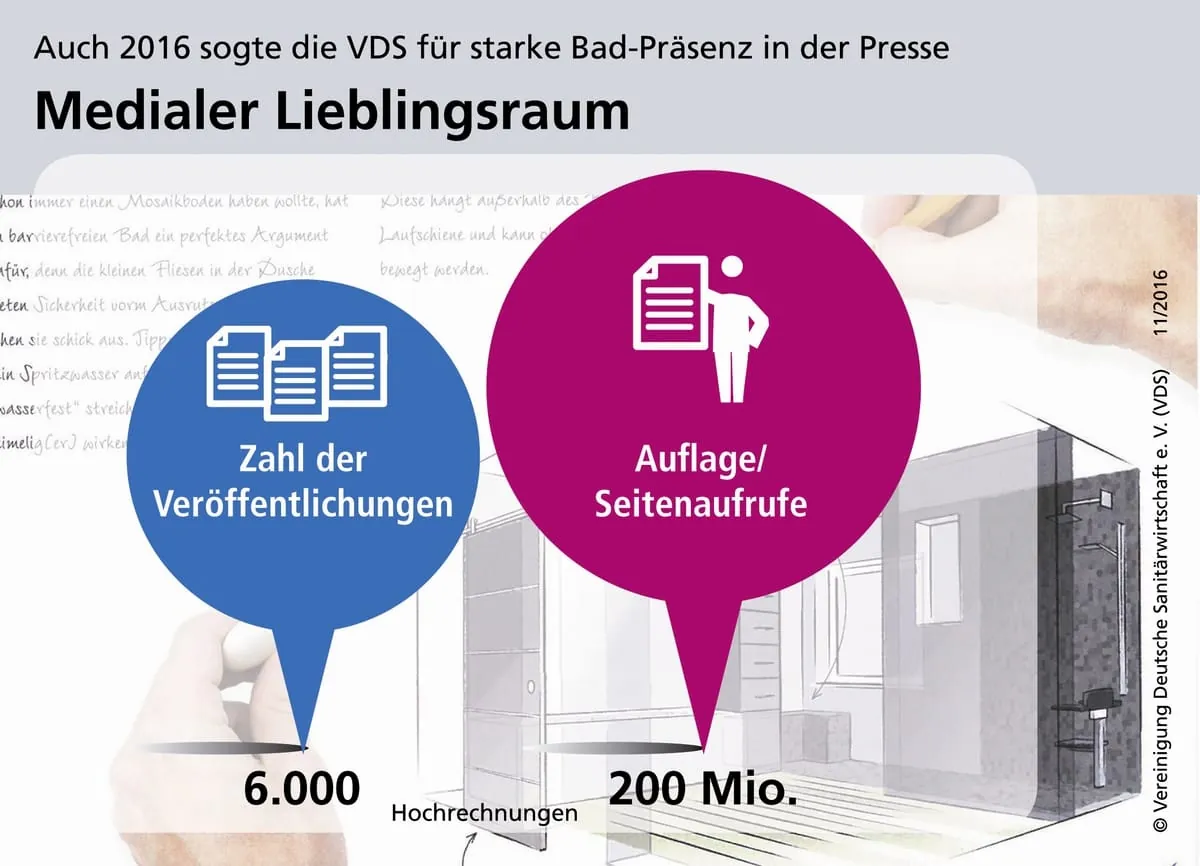- PR- und Öffentlichkeitsarbeit: Obwohl die VDS ihre geringeren finanziellen Mittel gezielt in wichtige Großprojekte wie den komplett neuen Auftritt von www.gutesbad.de, die Kompetenz- und Kommunikationsoffensive „Bad und Gesundheit“, die Vorarbeiten für die „ISH 2017“ und die Bad-Grundlagenstudie investiert habe, brachten die regulären Presse- und Medienaktivitäten auch 2016 „weit überdurchschnittliche“ Erfolgszahlen. Sie summierten sich gemäß Hochrechnungen auf ca. 6.000 Einzelabdrucke mit etwa 200 Mio. Auflage bzw. Seitenaufrufen. Diese Bilanz unterstreiche einmal mehr die „redaktionelle Karriere“ des Bades.