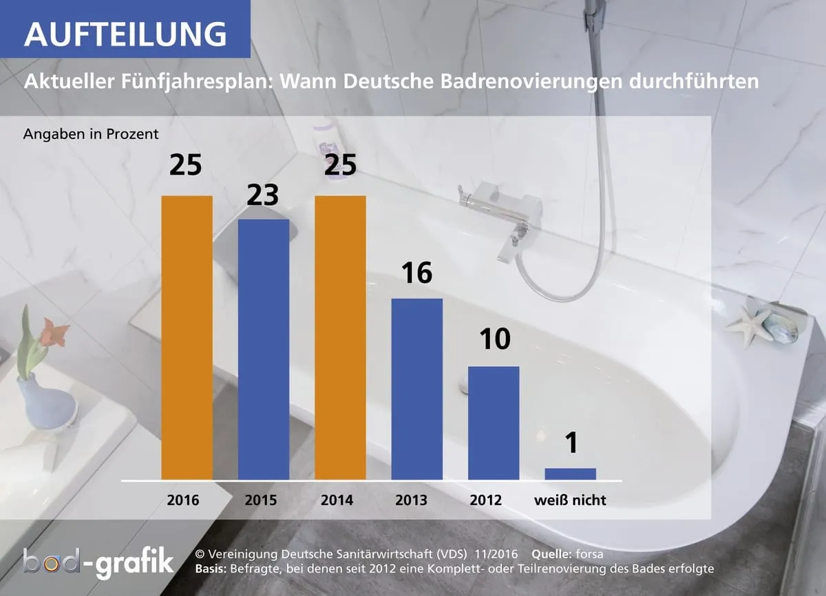 Bei der Frage, wann die Badrenovierung genau stattfand, bestätigte sich laut VDS der „stetig wachsende Bad-Stellenwert“. Denn: Die Modernisierungsintensität nahm danach mit Quoten zwischen 23 % und 25 % seit 2014 „signifikant“ zu. Der niedrigste Wert ergab sich für 2012 (10 %). Die Branche könne dies sicher auch als Erfolg ihrer systematischen Kommunikationsarbeit verbuchen.