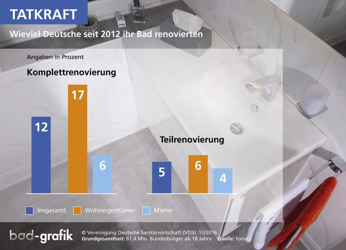 Danach sind 52 % bzw. 32 Mio. Personen Wohneigentümer, während 48 % bzw. 29,5 Mio. Personen zur Miete wohnen. Der Untersuchung zufolge erneuerten seit 2012 insgesamt 17 % der Bundesbürger ihr Bad entweder komplett (12 %) oder teilweise (5 %). Als Kriterium einer Teilrenovierung sei dabei mindestens der Austausch von wesentlichen Objekten wie Waschbecken, Badewanne, Toilette oder Dusche definiert worden. Bei Komplettsanierungen liege die Eigentümerquote mit 17 % erwartungsgemäß deutlich über dem entsprechenden Mieter-Anteil (6 %). Dagegen falle die Differenz bei den Teilrenovierungen (6 % bzw. 4 %) erheblich geringer aus.