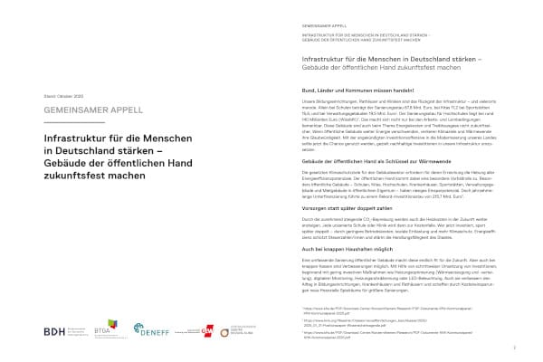Die Verbände BDH, BTGA, DENEFF, GEW und ZVSHK fordern in einem gemeinsamen Appell Bund, Länder und Kommunen auf, die energetische Sanierung öffentlicher Gebäude jetzt zur Priorität zu machen.