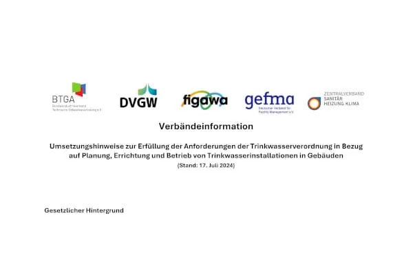 Eine Kooperation der Verbände BTGA, DVGW, figawa, gefma und ZVSHK informiert mit einer gemeinsam erstellten Verbändeinformation zur Trinkwasserinstallation in Gebäuden über gesetzliche Vorgaben und technische Anforderungen und gibt zudem Empfehlungen für die Trinkwasserinstallation.