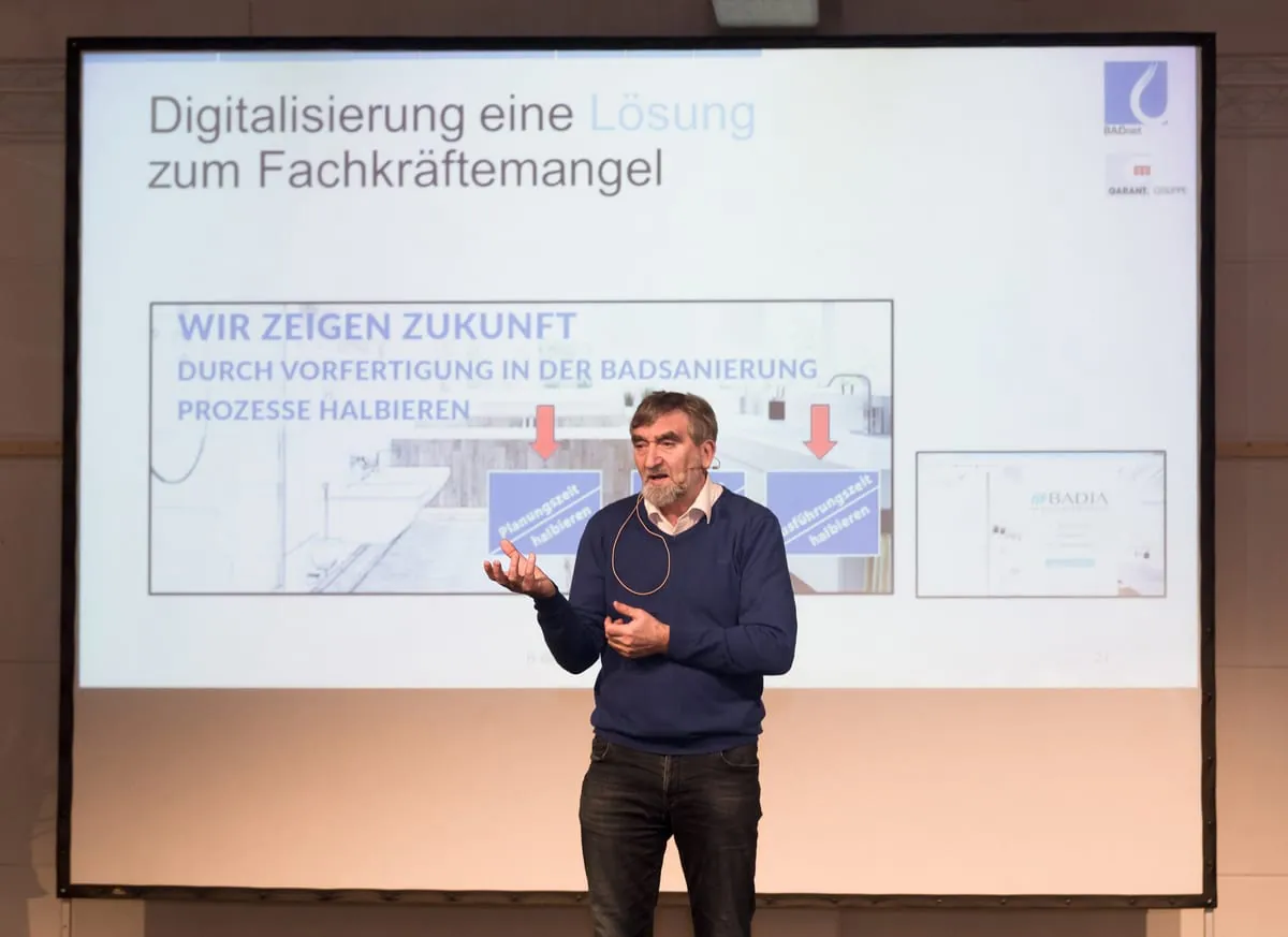 Ein Beitrag zur Lösung des Fachkräftemangels ist das Handwerk 4.0 Konzept von Ulrich Bergmann zur modularen Vorfertigung im Bäderbau. Hierbei greifen organisatorische Abläufe und Planungstools effizient ineinander, um einen bis ins Detail abgestimmten Prozess zu ermöglichen: In seiner Werkstatt werden heute Vorwände, Plattenmaterialien und selbst Fliesen mit exakt passenden Maßen und Ausschnitten für die Armaturen verarbeitet. Die Fliesen lässt er dabei numerisch gesteuert mit dem Verfahren des Wasserstrahlschneidens zuschneiden. Auf der Baustelle lassen sich dann die Sanitärprodukte ohne weitere Anpassungen an die Vorwandkonstruktion montieren. Zeitaufwändige und fehleranfällige Arbeiten wie das Ablängen von Anschlussstücken entfallen komplett. Mit seinem integrierten Badverkaufs- und Badbauprozess kommt Bergmann wesentlich schneller zum Auftrag, er nutzt die kostbare Zeit seiner Fachkräfte sehr viel effizienter und er produziert unterm Strich eine höhere Qualität zu niedrigeren Kosten. Der Vortrag vermittelte einen hervorragenden Eindruck, was die Digitalisierung im Handwerk heute bewegen kann.