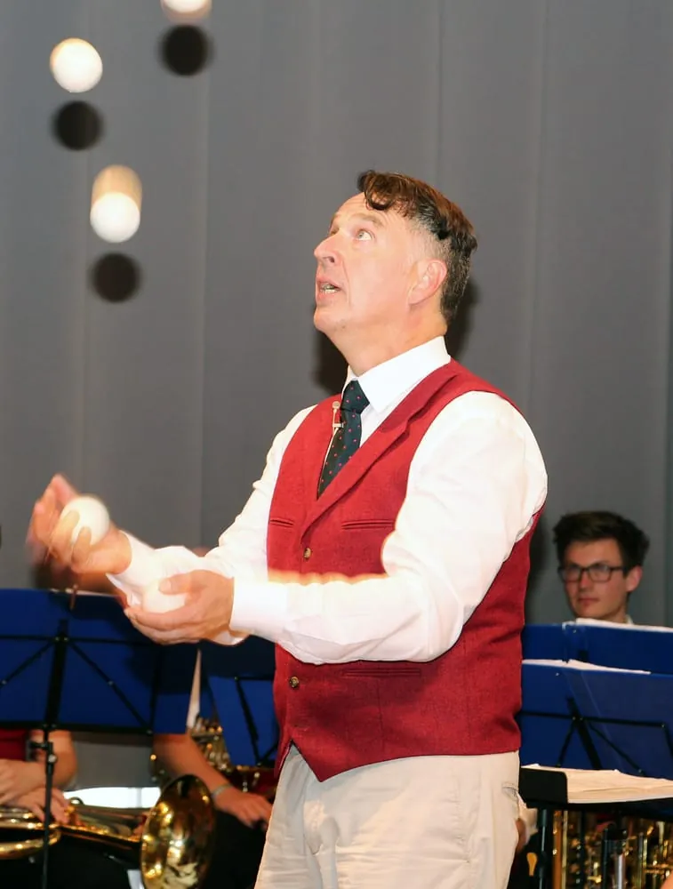 „Mut tut gut“ – so lautete das Credo des Festredners Johannes Warth, der die Gäste der Öffentlichen Mitgliederversammlung bestens unterhielt. Mit Musik, Artistik, Wortspielen und jeder Menge Humor verdeutlichte der Entertainer, wie wichtig die richtige Einstellung ist für die Verwirklichung persönlicher und unternehmerischen Ziele: „Was man sät, erntet man.“ Und so sei entscheidend, mit welcher Ausstrahlung man als Unternehmer morgens im Betrieb starte. „Das was Sie jeden Morgen im Spiegel sehen, müssen Ihre Mitmenschen den ganzen Tag ertragen“, so Warth augenzwinkernd. Sätze wie „Das haben wir schon immer so gemacht“ passten nicht zu freiem unternehmerischen Denken und Handeln. Zukünftige Herausforderungen böten Chancen und das Wort „Chance“ sei nicht weit entfernt vom Begriff „Change“ – Veränderung. Am Beispiel einer Jonglage zeigte der selbsternannte „Ermutiger“, dass man Neues schlichtweg versuchen muss. Und auch wenn die Bälle eins um andere Mal zu Boden purzeln, gelte es, sie aufzuheben und ein weiteres Mal zu üben. „Investieren Sie in eine Sache, wenn Sie sich dafür begeistern, auch wenn Sie nicht gleich zum Erfolg führt.“
