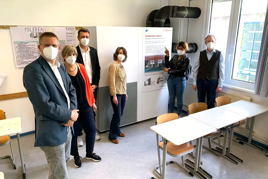 Um einen Lösungsbeitrag zu leisten, hat Viessmann mit Vitovent 200-P ein neues Luftreinigungsgerät entwickelt. Dabei handelt es sich um einzigartige hybride Lüftungsgeräte, die Räume dauerhaft mit Frischluft versorgen und gleichzeitig eine Luftreinigung vornehmen. Durch eine permanente Luftzirkulation werden Aerosole reduziert und geschlossene Räume immer wieder mit frischer Außenluft versorgt, damit Schüler und Lehrer bestmöglich vor einer Virus-Ansteckung geschützt und die Lerneffizienz gesteigert wird. Erstmals wurden jetzt in einer Berliner Schule vier dieser Geräte installiert.