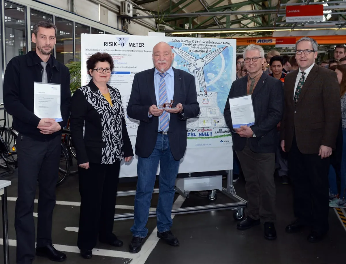 Der „Schlaue Fuchs“ ist aus Glas, etwa zehn Zentimeter lang und sehr begehrt bei Unternehmen, die sich intensiv mit den Themen Arbeits- und Gesundheitsschutz beschäftigen. Dr. Doris Langner, Bezirks-Leiterin des Präventionsdienstes der Berufsgenossenschaft Holz und Metall (BGHM), war eigens aus Erfurt angereist, um die Auszeichnung für das Projekt „VERA“ gemeinsam mit ihren Kollegen Franz-Dieter Thoma und Christoph Marc an Mitarbeiter von Viessmann zu überreichen.