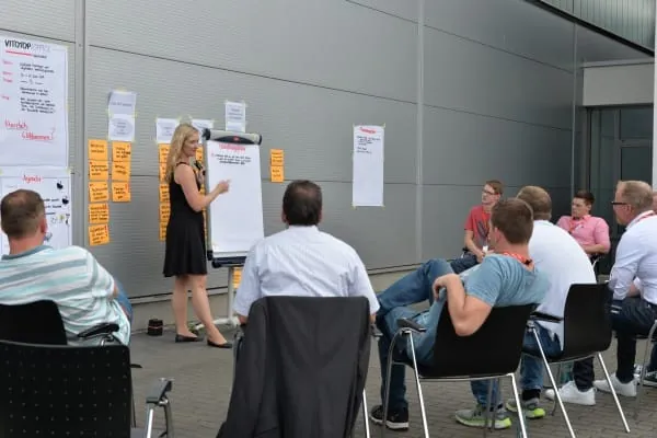 Zum Einstieg stand folgerichtig ein Rückblick auf die im Rahmen der ISH präsentierten „Digitalen Services“ auf dem Programm. Anschließend ging es mit verschiedenen Vorträgen zur Digitalisierung weiter, bevor die Teilnehmer in den Workshops selbst gefordert waren. Bearbeitet wurden unterschiedliche Installationsszenarien, die Moderation erfolgte durch Viessmann Mitarbeiter, die auf Effizienzsteigerungsmaßnahmen sowie auf die Problemlösungsmethode „Design Thinking“ spezialisiert sind. Nach zwei spannenden und informativen Tagen bestand schließlich Gelegenheit, die gefundenen Lösungsansätze vorzustellen und im großen Kreis zu diskutieren.